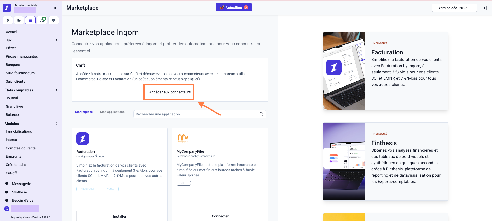 Mise en place d'un connecteur Chift sur un dossier depuis la marketplace Inqom.