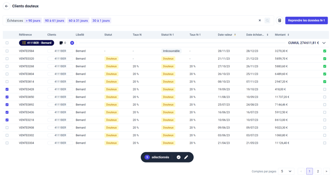 Vous pouvez choisir de sélectionner plusieurs créances, ou même un client dans son intégralité, afin d'appliquer un même statut et un taux de dépréciation uniforme à toutes ses créances.