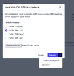 Avec Inqom, intégrer vos écritures dans la comptabilité devient rapide, fiable et sans risque d’erreur. Après avoir converti votre fichier .TRA, les écritures doivent être intégrées dans la comptabilité via le tunnel d’import.