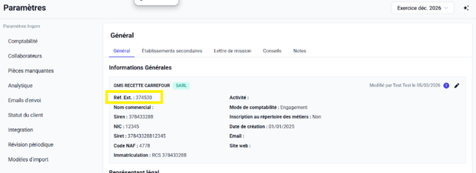 - Renseigner la référence externe du client