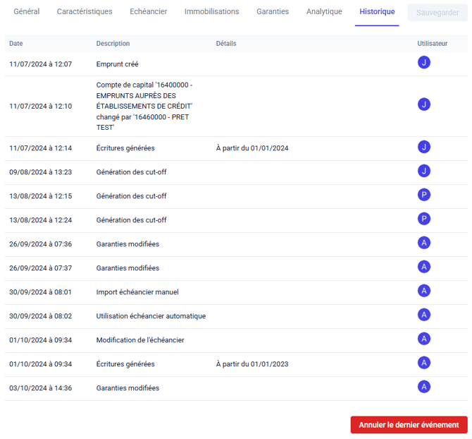 Le bouton Annuler le dernier événement permet de supprimer le dernier événement créé. Les écritures comptables impactées par cet événement seront alors modifiées pour prendre en compte cette suppression. L'onglet Historique sera alimenté par une nouvelle ligne Annulation de l'événement.