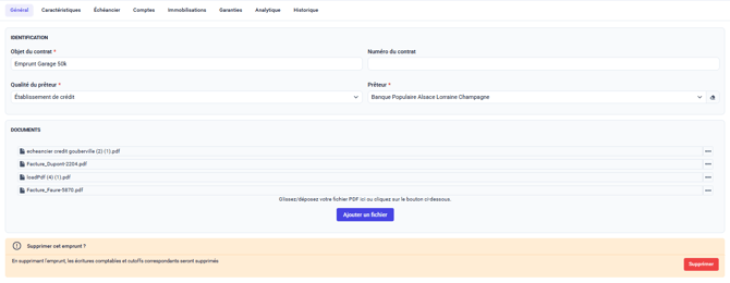 Les champs présents dans cet onglet permettent de visualiser les informations complétées lors de la création de l'emprunt, et de les modifier si besoin. Il est également possible d'ajouter un fichier au format PDF, en cliquant sur le bouton "ajouter un fichier" ou bien en glissant-déposant le fichier sur l'icône. Enfin, il est possible de supprimer l'emprunt.