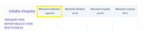 - Crédits d’impôts : La colonne “montant antérieur reporté” est alimentée automatiquement depuis N‑1, si disponible.