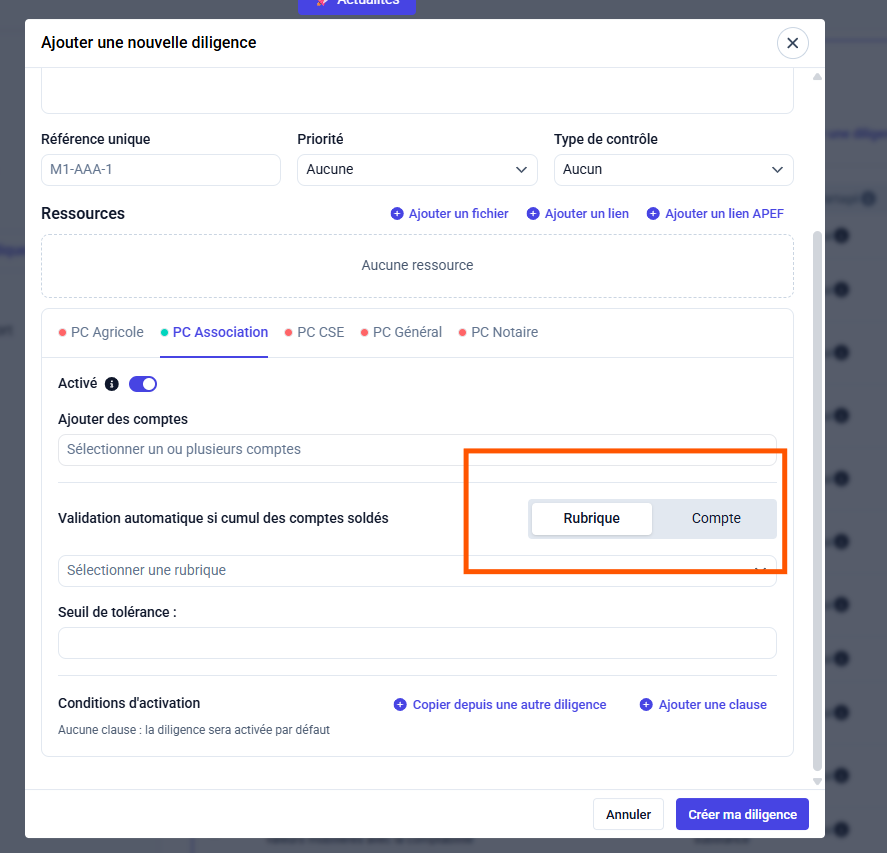 Clarification du design sur les diligences automatisées par solde de comptes/rubriques avec un bouton de switch plus clair pour l'utilisateur accompagné d'un message beaucoup plus clair pour modifier le paramétrage des comptes/rubriques si l’un deux est déjà présent